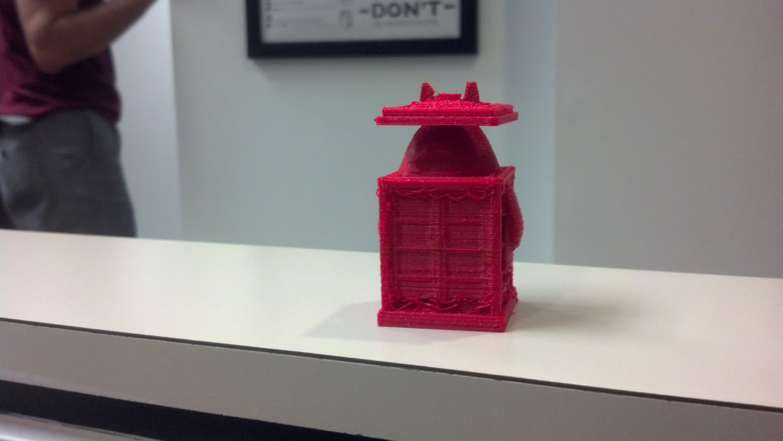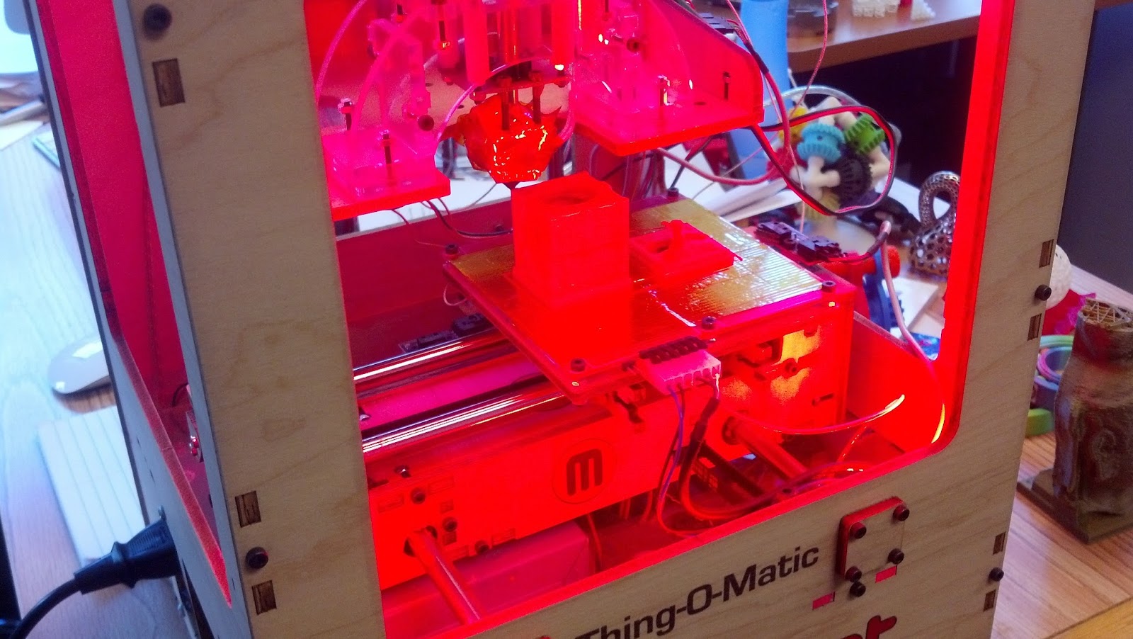 I considered this something of a masterpiece. The real test, though, is "will it print?" So we heated up the ole makerbot. Unfortunately, we only had red plastic to work with, and it isn't the highest resolution printer around, but it did its duty:
