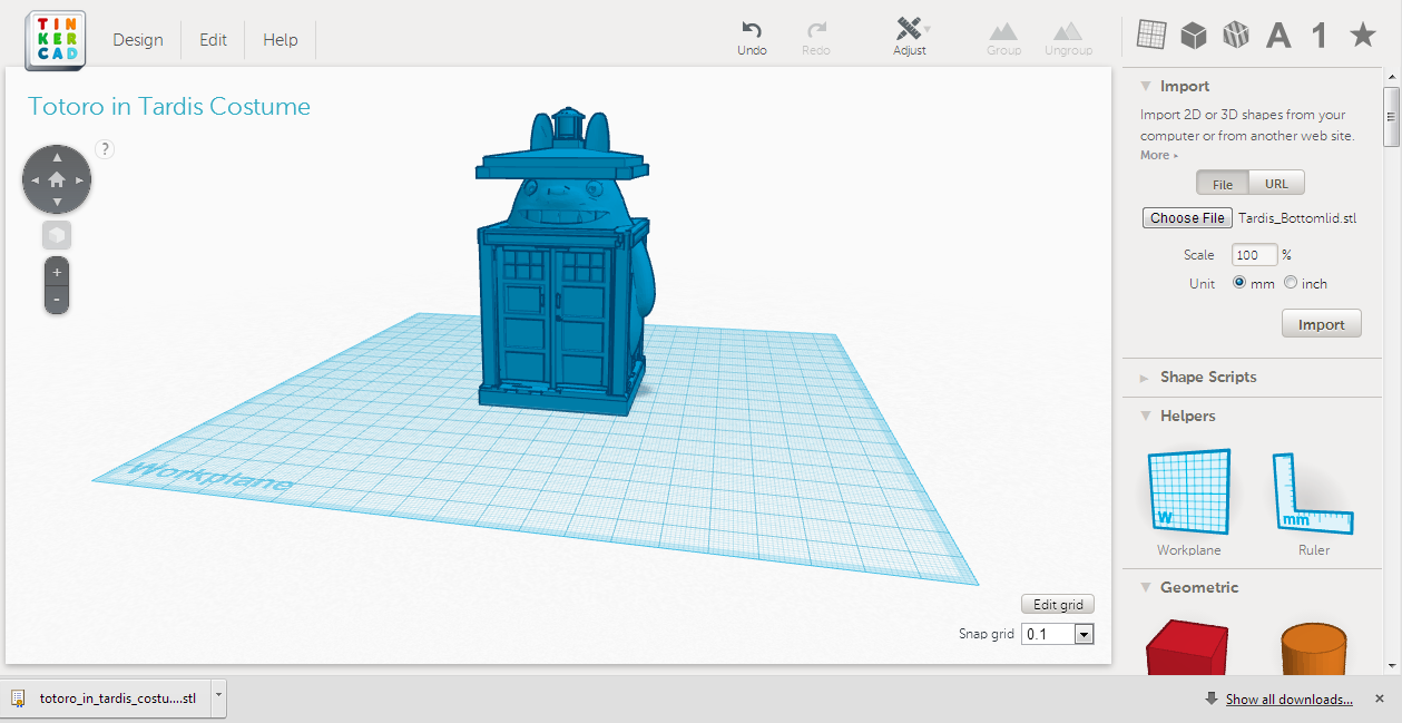 The concept is that Totoro is dressed as the TARDIS for Halloween. I found several models to use as sources on Thingiverse, and proceeded to chop them up and recombine them in Tinkercad. The result looked pretty cool, but then I realized that the "hat" part would be difficult to 3D print (since the printer puts layers down from the bottom up, unsupported floating sections in a design won't turn out well). So I redesigned it to make the hat removable, including ear-holes big enough to fit on Totoro's head: